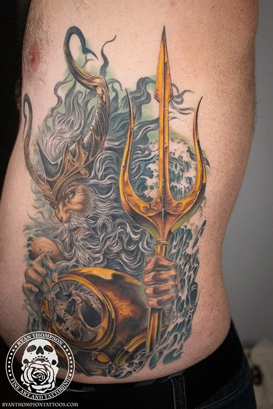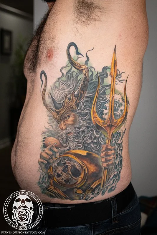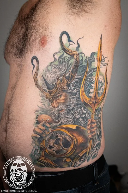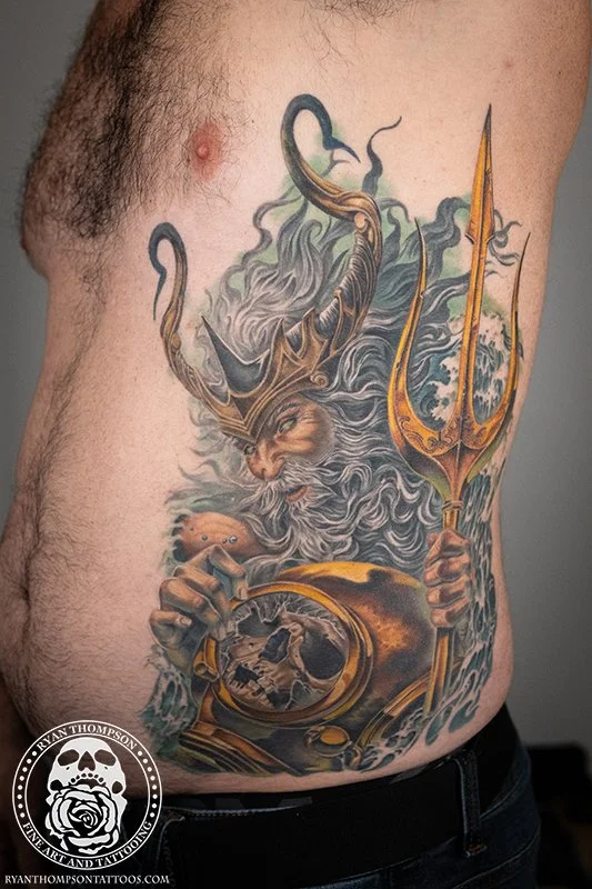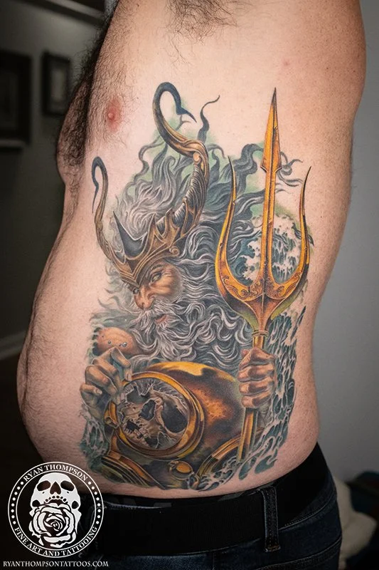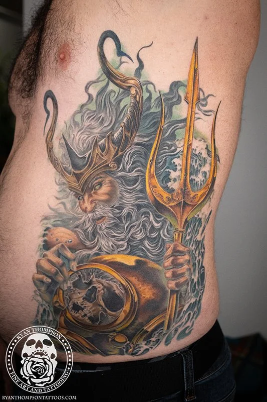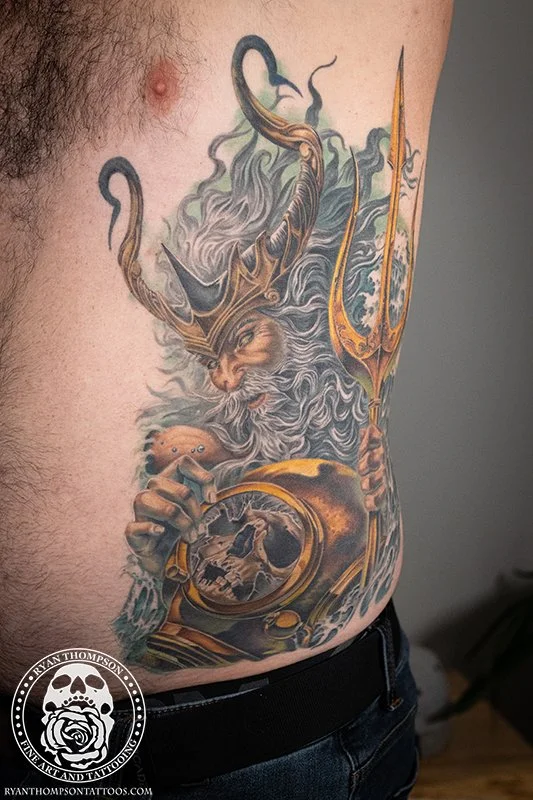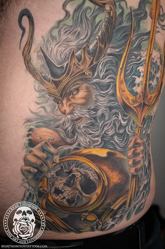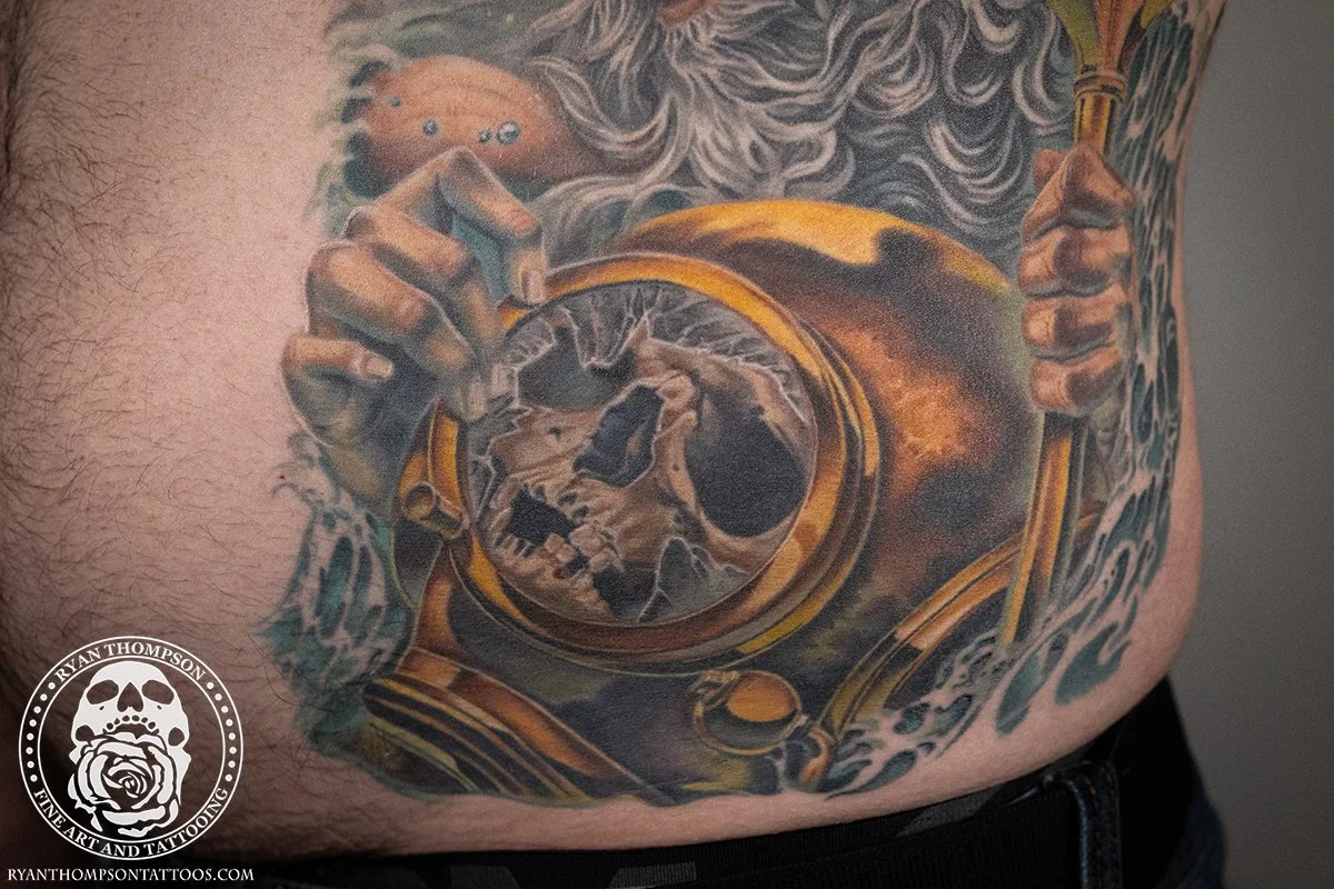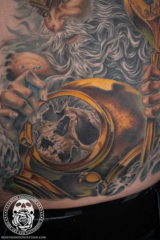Mike’s Poseidon with trident, diving helmet and skull took around 24 hours over 8 sessions.